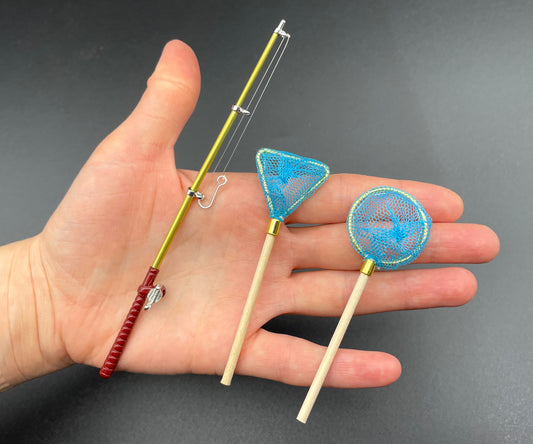 Miniature Fishing Rods and Nets. Blue or Green. 1:12 Scale