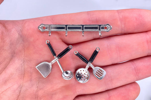 Miniature Silver Utensils Spatula Ladle Slotted Spoon Wall Rack Set. Dollhouse Kitchen Accessories. 1:12 Scale