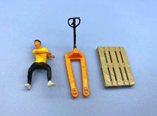 Miniature Worker With Pallet and Truck Figures. Warehouse Fork Trolley. 1:64 Scale