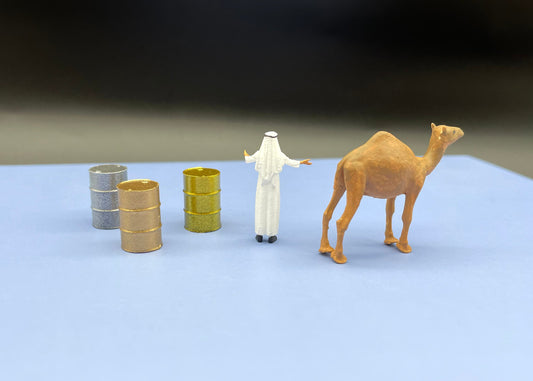 Oil Sheikh, Oil Barrels and Camel. Miniature Figures / Models. 1:64 Scale