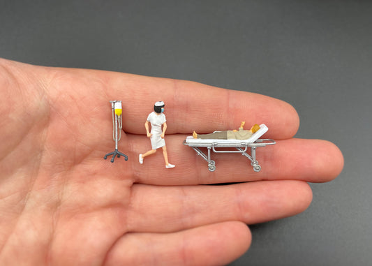 Nurse with Patient on Stretcher and IV. Miniature 1:64 Scale Model