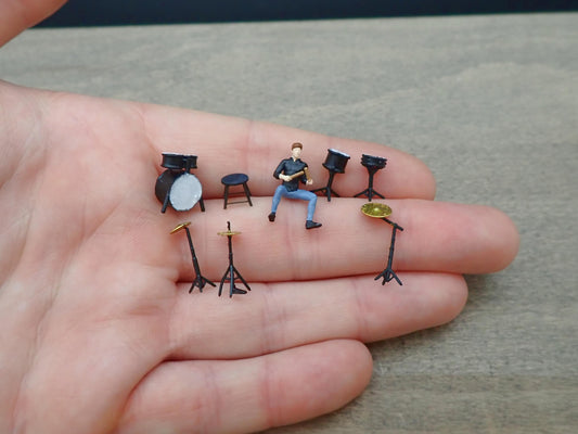 Miniature Drummer and Drum Kit. 8 Pieces. 1:64 Scale Model Figure