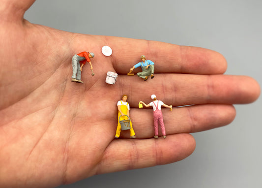 4 Painters / Decorators Miniature Figures and Paint Can. Realistic Human Models. 1:87 Scale