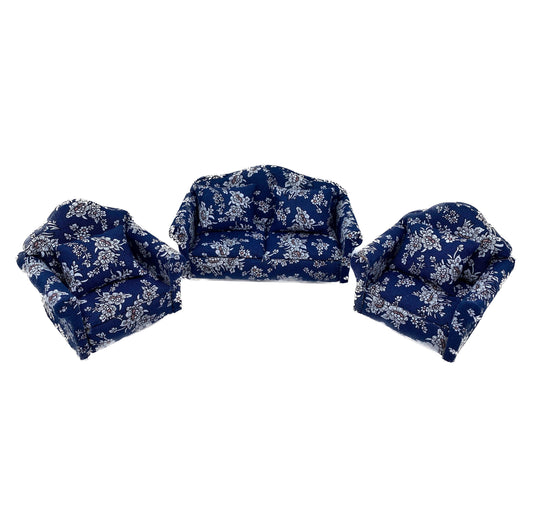 1:12 Scale Miniature 3 piece Vintage Floral Mini Blue Sofa Couch Double Armchair Set Cushion Pillow Lounge Model Dollhouse Furniture