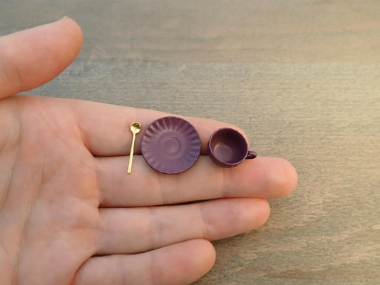 1:6 Scale Coffee Cup, Saucer, Spoon. (Yellow, Blue, Green, Purple or Brown). Realistic Miniature Kitchen Accessories