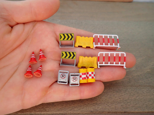 14-Piece Road Construction Signs Set 1:64 Scale - Miniature Traffic Cones, Barriers, Barricades for Diorama, Model Railroad, City Scene