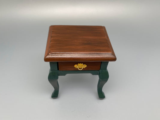 1:12 Scale Miniature Hand Painted Wooden Side Table. Brown and Green Bedside Table Accessory