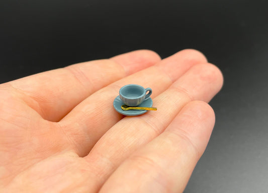Miniature Coffee Cup, Saucer, Spoon. (Yellow, Blue, Green, Purple or Brown) 1:12 Scale