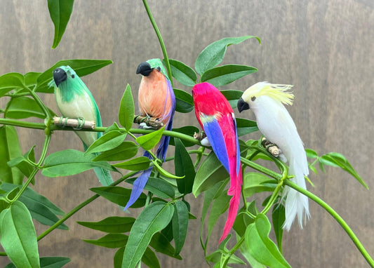 Miniature Parrots. Fairy Garden Colorful Birds.