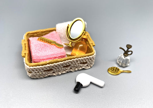 Miniature Mini Toiletry Baskets and Towels. Bathroom Accessories. 1:12 Scale