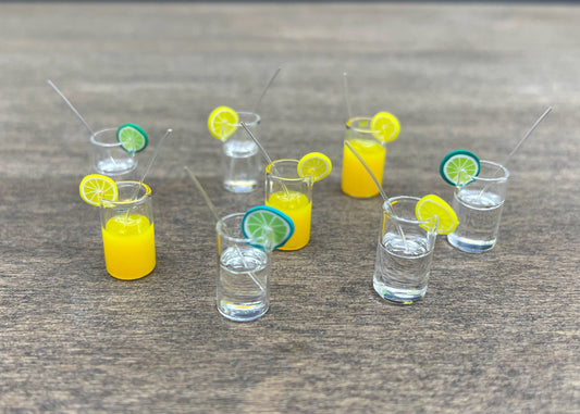 Miniature Orange Juice and Water and Gin & Tonic Glasses. 3 Glasses Set. Drinks with Straws and Lemon / Lime slices. 1:12 Scale