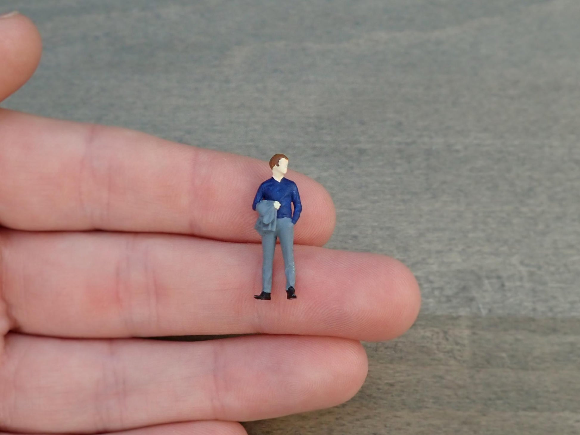 Heights: 'Touching Hair Girl' is 1 inch (2.6cm) tall. The men stood still are approximately 1.15 inches (2.9cm) tall. All figures are the same scale (1/64 scale).