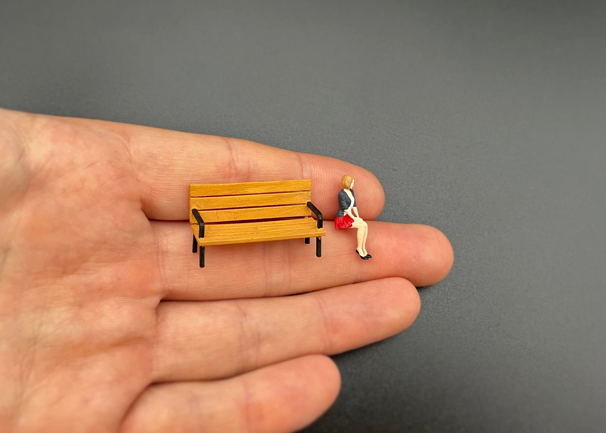 'Woman and Bench'. Woman: 0.87 inches (2.2 cm), Bench: 0.67 inches (1.7 cm)